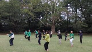 2015年、練馬・上石神井教室の屋外行事として、教室のすぐ近くにある公園で始まった「あおぞら太極拳」は、翌年から新宿御苑に場所を移し、養心会主催の行事となりました。昨年は雨で中止になりましたが、今年は10月21日に実施されました。室内行事と違って、来園者が大勢に訪れる公の場所で行われるイベントであるため、前もって練馬・上石神井教室の皆さんと共に2回、下見を行いました。そして、紅葉葉鈴懸の木とヒマラ杉の大樹に囲まれ、裸足でも太極拳が行える柔らかな芝生域が選ばれました。