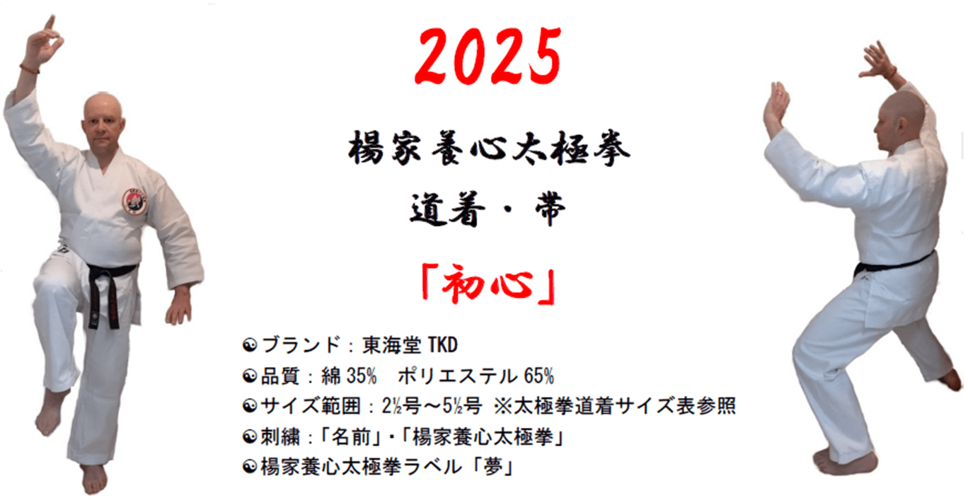 最新版!道着のパンフレットが出来ました お知らせ 2025.11.08 2025 楊家養心太極拳 道着・帯「初心」> パンフ最新版(2025年11月改定) <グッズ>のページをごらんください。 *従前版をお持ちの方は、新しいパンフレットに差し換えてください。