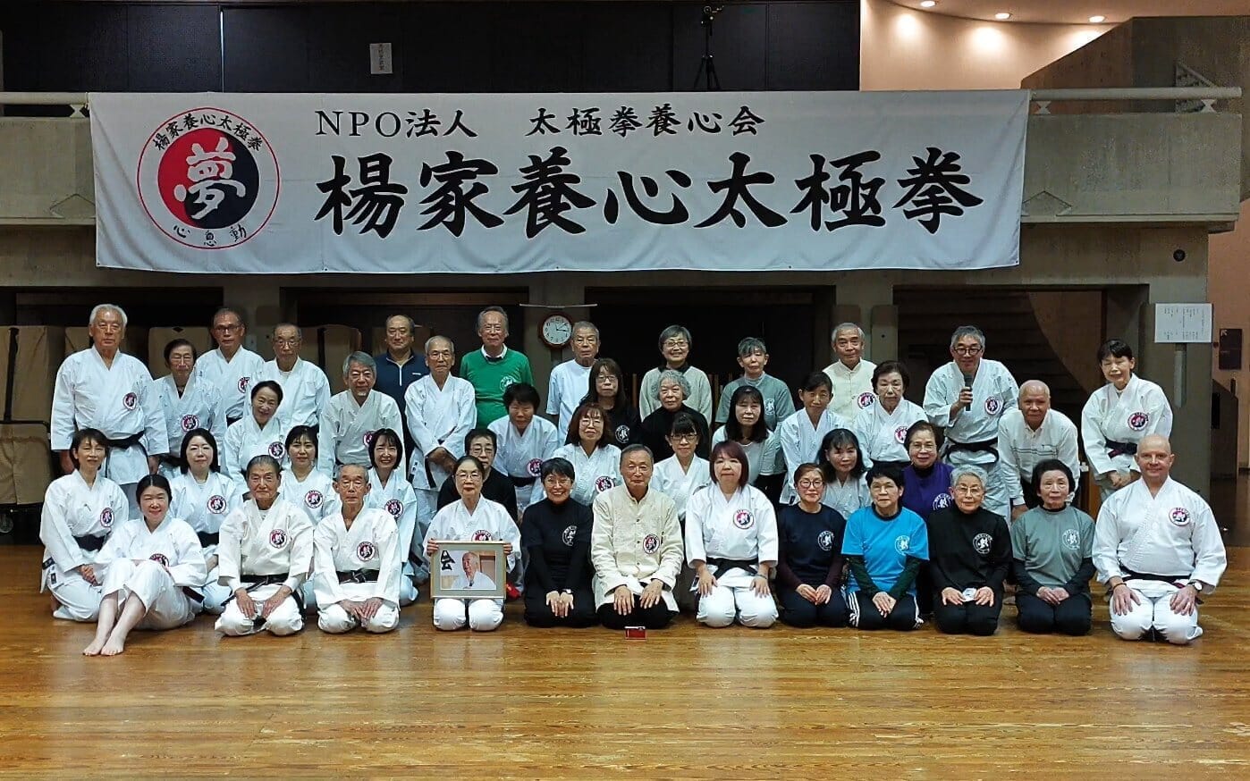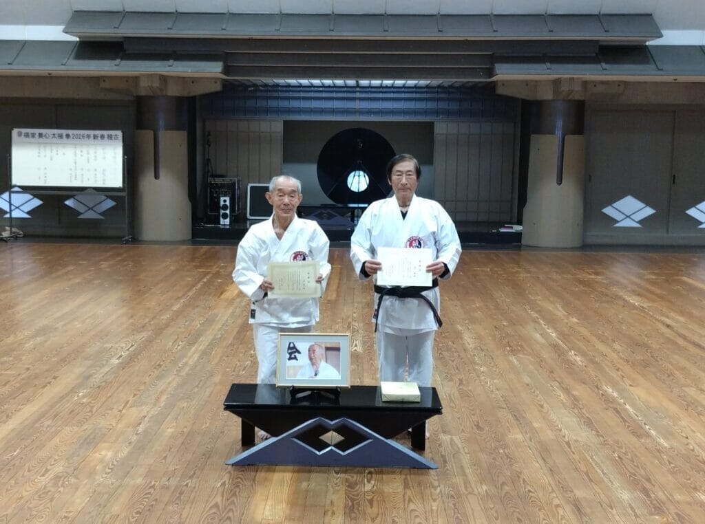 楊名時先生の遺影を正面にして、立禅・八段錦・太極拳24式を全員で行うにつれて、気息が整い、衣擦れのかすかな音も心地よく、新春稽古ならではの淑気に包まれていました。