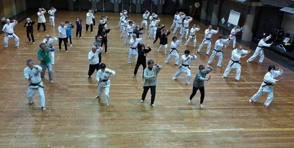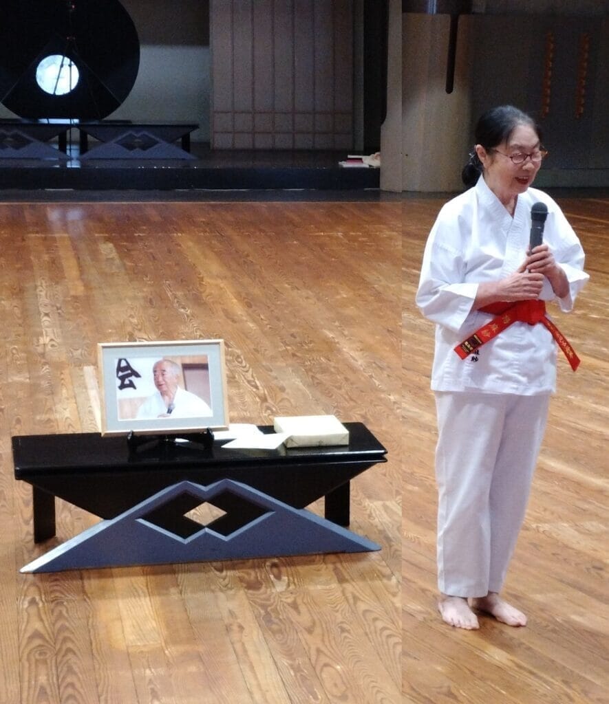 この後、高齢者表彰が行われ、今年は91歳の吉田貴旨師範と80歳の栗山一雄師範が表彰されました。続いて、参加者の紹介があり、お互いに拍手で歓迎し合いました。特に岩手・久慈市の遠方より参加された飯塚・晶子夫妻には、大きな拍手が上がりました。