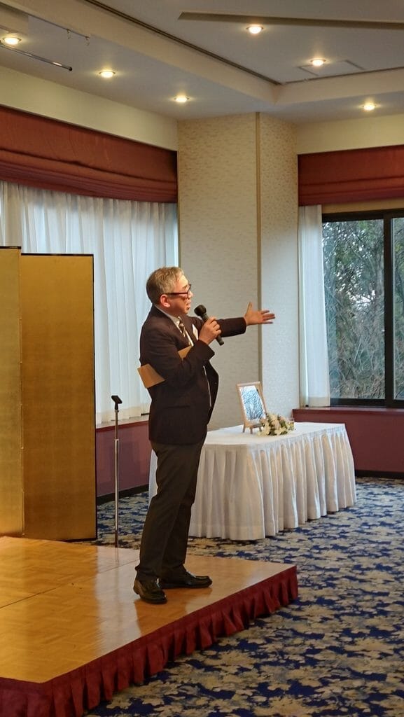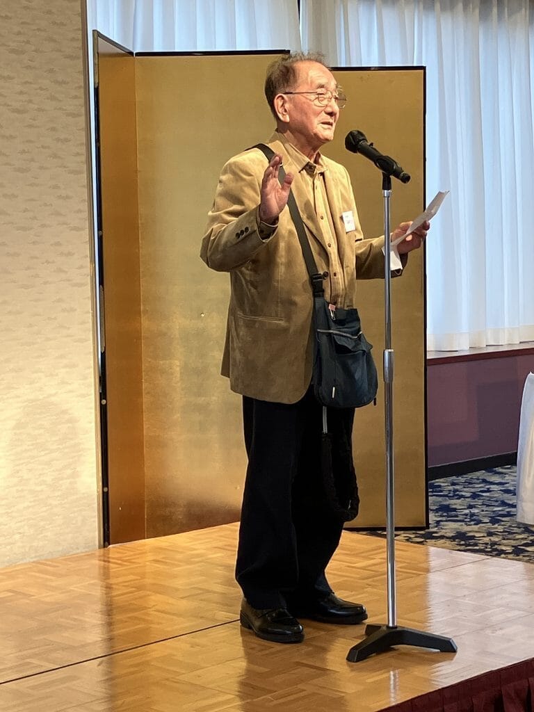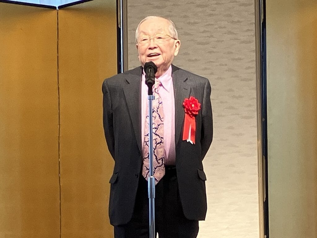 次に帯津良一先生は、お顔の肌艶も良く、ピンクのワイシャツがお似合いで、若々しく登壇。90歳には思えないお姿です。「挨拶はとても短く、あちらに行きましたら、楊名時先生と酒を酌み交わすことを今から楽しみにしています」と。楊名時先生との交流の深さを感じさせるお挨拶でした。