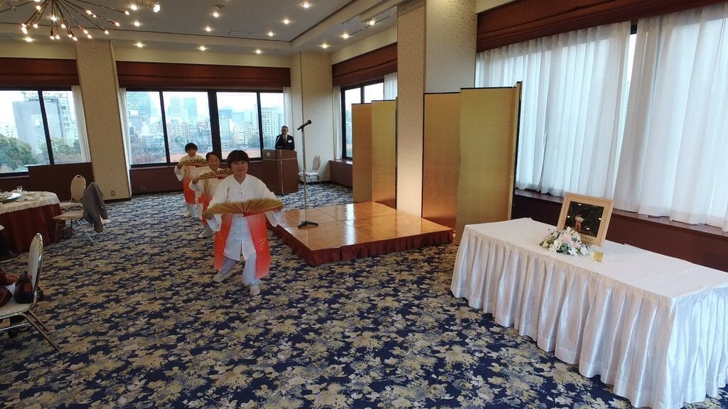宴もたけなわとなり、余興に入りました。トップバターは大口町の「太極扇」。白地の衣装にブルーの大きな扇を持ち、太極拳24式を華麗に舞って下さいました。目の覚めるような動きに、みんな魅了されました。続いて役員と常滑組による合唱「上を向いて歩こう」を森智恵師範の手話を交えて歌いました。その前に、岡崎間矢師範の「星に願いを」の独唱がありました。参加者全員もそれに唱和して、会場の気が一段と高まりました。